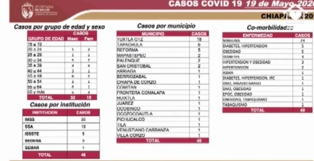 El secretario de Salud en Chiapas, José Manuel Cruz Castellanos, informó este martes que ya hay muertes todos los días en la Entidad a consecuencia del Covid-19. Anuncio 5 nuevas defunciones, una de ellas en Tapachula, con lo que se llega a 63. El funcionario también dijo que en las últimas 24 horas dieron positivo otras 48 personas en la entidad, con lo que se llega a los 743 desde que empezó la pandemia. En el caso de Tuxtla Gutiérrez hoy fueron 18, mientras que en Tapachula se reportaron otros seis.