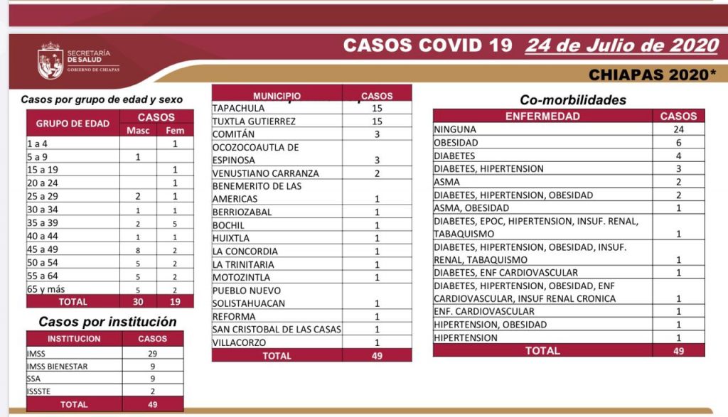 En las últimas 24 horas hubo un repunte de los casos de Covid-19 en los municipios de Tuxtla Gutiérrez y Tapachula, luego de que habían tenido descensos considerables la semana pasada. Este viernes, el director de Atención Médica, Ariosto Coutiño Niño, informó que hay: 5 mil 173 casos acumulados y 421 defunciones La distribución por municipio de los casos más recientes es la siguiente: Tapachula y Tuxtla Gutiérrez, 15 casos cada uno; Comitán y Ocozocoautla, tres cada uno; Venustiano Carranza, dos; y Benemérito de las Américas, Berriozábal, Bochil, Huixtla, La Concordia, La Trinitaria, Motozintla, Pueblo Nuevo Solistahuacán, Reforma, San Cristóbal de Las Casas y Villa Corzo, un caso cada uno. Se trata de 30 hombres y 19 mujeres, entre ellos tres menores de edad. Mientras que, entre los últimos seis decesos por esa enfermedad, esta la de un señor de 52 años, residente del municipio de Huehuetán, y otro de 61, de Tapachula.