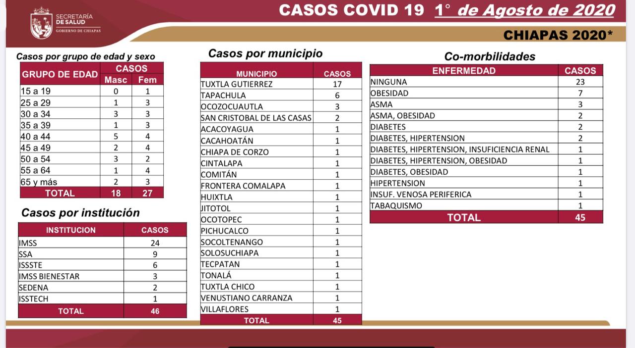 La Secretaría de Salud en Chiapas informó este sábado sobre otros 45 positivos de Covid-19 en Chiapas, con los que llega a 5 mil 530 casos acumulados. Tambien cinco decesos en las últimas 24 horas por esa enfermedad en el Estado, con los que ya suma un total de 460. De los pacientes infectados más recientes, se informó que, en Tuxtla Gutiérrez, son 17; mientras que, en Tapachula, seis. Entre los fallecidos está una señora, de 75 años de edad, residente del municipio de Huehuetán, quien sufría de hipertensión. Así también, un señor de 64 años, con domicilio en el municipio de Motozintla, quien tenía antecedentes de hipertensión y tabaquismo.