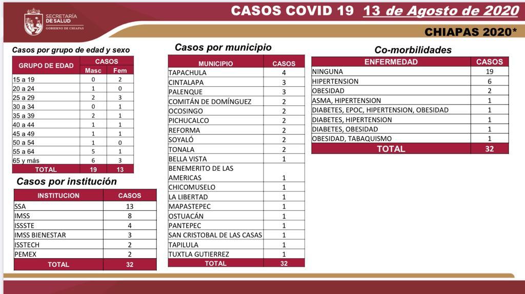 La Secretaría de Salud en Chiapas informó que, en las últimas horas, fueron dados de alta otros 58 pacientes que estuvieron hospitalizados en la entidad por Covid-19, con lo que ya suman 4 mil 315. También se confirmaron 32 pacientes positivos y cuatro defunciones, con lo que hay un total de 5 mil 960 casos acumulados y 506 decesos. Los positivos nuevos fueron en Tapachula, con cuatro; Cintalapa y Palenque, tres cada uno; Comitán, Ocosingo, Pichucalco, Reforma, Soyaló y Tonalá, dos; y Bella Vista, Benemérito de las Américas, Chicomuselo, La Libertad, Mapastepec, Ostuacán, Pantepec, San Cristóbal de Las Casas, Tapilula y Tuxtla Gutiérrez, uno. Entre los fallecidos está un señor de 70 años, originario de Tapachula, quien presentaba diabetes, hipertensión y obesidad.