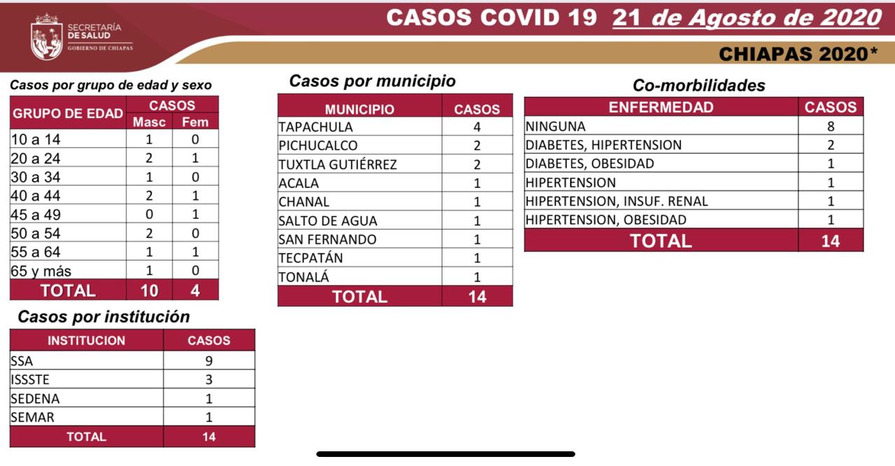 La Secretaría de Salud informó este viernes sobre solo 14 casos nuevos de COVID-19 y dos decesos en el balance realizado en las últimas 24 horas en la.entidad De tal manera que, a 179 días de la pandemia, el acumulado para Chiapas es de 6 mil 143 casos y 529 defunciones. Los positivos más recientes se registraron en los municipios de: Tapachula, cuatro; Pichucalco y Tuxtla Gutiérrez, dos cada uno; y Acala, Chanal, Salto de Agua, San Fernando, Tecpatán y Tonalá, un caso cada uno. Se trata de 10 hombres y cuatro mujeres, entre ellos un menor de edad. Entre los decesos está la de un señor de 63 años, originario del municipio de Tapachula, quien presentaba obesidad.