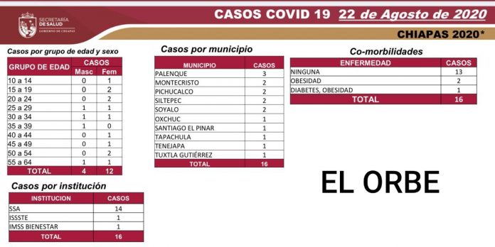 Tapachula volvió a ser noticia nacional este sábado, al reportarse oficialmente un solo caso de Covid-19 en las últimas 24 horas. Incluso, Chiapas sólo confirmó 16 nuevos infectados, es decir, un 10 por ciento de lo ocurrido hace un par de meses. De los 16 positivos de este dia,12 son mujeres y cuatro hombres, además de tres decesos. Los positivos nuevos se registraron en los municipios de Palenque, tres; Montecristo de Guerrero, Pichucalco, Siltepec y Soyaló, dos casos cada uno; y Oxchuc, Santiago El Pinar, Tapachula, Tenejapa y Tuxtla Gutiérrez, uno. Entre las defunciones está una señora de 62 años, en Mapastepec, quien padecía obesidad: además de otra, de 44, en Tapachula.
