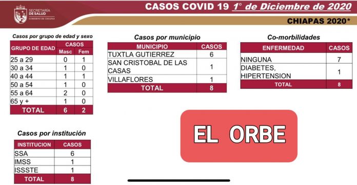 La Secretaría de Salud dio a conocer este martes que los que dieron positivo en las últimas 24 horas son en los municipios de Tuxtla Gutiérrez, seis; y San Cristóbal de Las Casas y Villaflores, un caso cada municipio.
