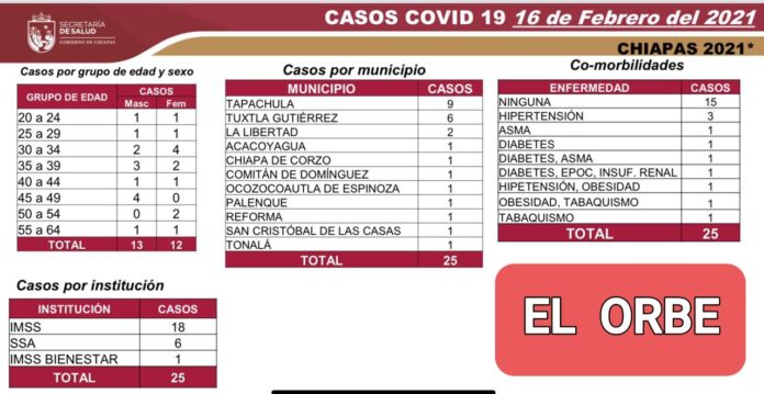 Los contagios de las últimas 24 horas se detectaron en los municipios de Tapachula, con nueve casos; Tuxtla Gutiérrez, seis; La Libertad, dos; y Acacoyagua, Chiapa de Corzo, Comitán, Ocozocoautla, Palenque, Reforma, San Cristóbal de Las Casas y Tonalá, un caso cada uno.