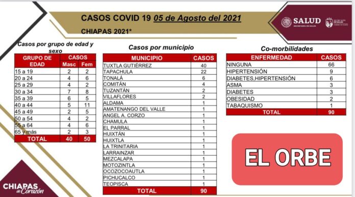 La Secretaría de Salud estatal dio a conocer que los casos positivos se presentaron en los municipios de: Tuxtla Gutiérrez, 40; Tapachula, 22; Tonalá, seis; Comitán, cuatro; Tuzantán y Villaflores, dos cada uno; y Aldama, Amatenango del Valle, Ángel Albino Corzo, Chamula, El Parral, Huixtán, Huixtla, La Trinitaria, Larráinzar, Mezcalapa, Motozintla, Ocozocoautla, Pichucalco y Teopisca, un contagio cada municipio.