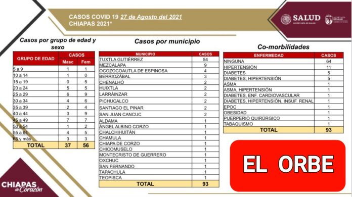 La incidencia ocurrió en:: Tuxtla Gutiérrez, 54; Mezcalapa, nueve; Ocozocoautla, cuatro; Berriozábal, tres; Chenalhó, Huixtla, Larráinzar, Pichucalco, Santiago El Pinar y San Juan Cancuc, dos cada uno; y Aldama, Ángel Albino Corzo, Chalchihuitán, Chamula, Chiapa de Corzo, Chicomuselo, Montecristo de Guerrero, Oxchuc, San Fernando, Tapachula y Teopisca, un contagio cada municipio.