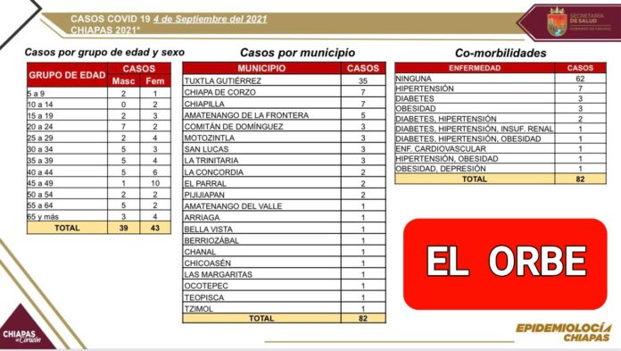 Los casos recientes se presentaron en los municipios de: Tuxtla Gutiérrez, 35; Chiapa de Corzo y Chiapilla, siete cada uno; Amatenango de la Frontera, cinco; Comitán, Motozintla, San Lucas y La Trinitaria, tres cada uno; La Concordia, El Parral y Pijijiapan, dos cada uno; y Amatenango del Valle, Arriaga, Bellavista, Berriozábal, Chanal, Chicoasén, Las Margaritas, Ocotepec, Teopisca y Tzimol, un contagio cada municipio.