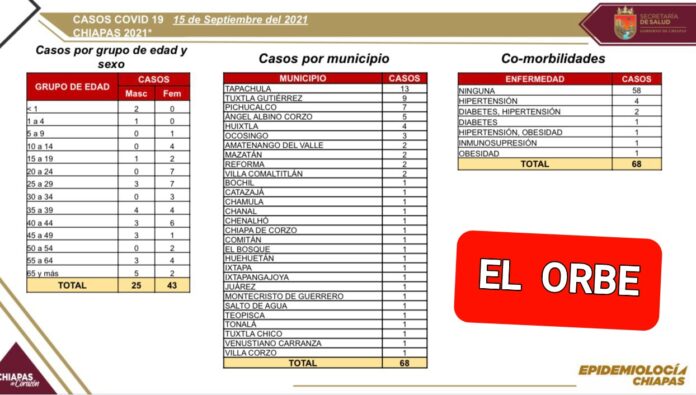 Los municipios que registraron contagios son: Tapachula, 13; Tuxtla Gutiérrez, nueve; Pichucalco, siete; Ángel Albino Corzo, cinco; Huixtla, cuatro; Ocosingo, tres; Amatenango del Valle, Mazatán, Reforma y Villa Comaltitlán, dos cada uno; y con un caso, Bochil, Catazajá, Chamula, Chanal, Chenalhó, Chiapa de Corzo, Comitán, El Bosque, Huehuetán, Ixtapa, Ixtapangajoya, Juárez, Montecristo de Guerrero, Salto de Agua, Teopisca, Tonalá, Tuxtla Chico, Venustiano Carranza y Villa Corzo.