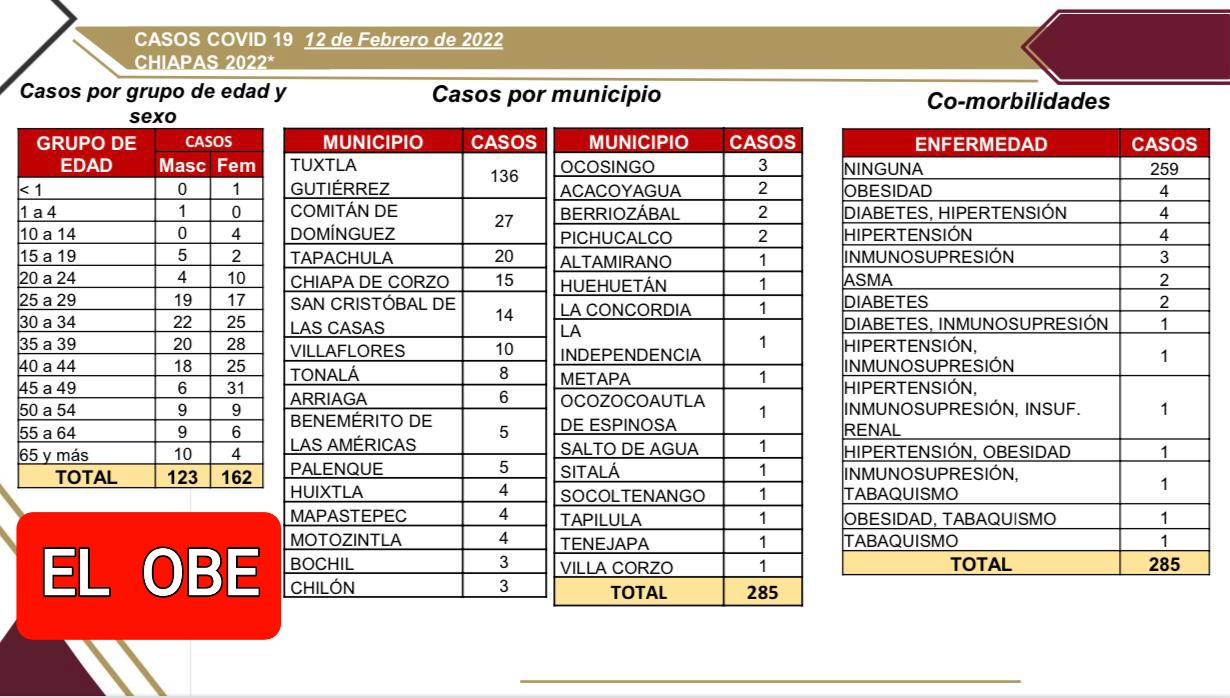 ALERTA EN CHIAPAS En aumento las muertes por Covid-19 en el estado y los contagios en niños.y adolescentes. De acuerdo a la Secretaría de Salud, en las últimas 24 horas dieron positivo otras 285 personas en la entidad, incluidos un recién nacido, 5 niños, 7 adolescentes y 50 jóvenes de entre 20 y 29 años de edad. Los contagios recientes se presentaron en de Tuxtla Gutiérrez, 136; Comitán, 27; Tapachula, 20; Chiapa de Corzo, 15; San Cristóbal de Las Casas, 14; Villaflores, 10; Tonalá, ocho; Arriaga, seis; Benemérito de las Américas y Palenque, cinco; Huixtla, Mapastepec y Motozintla, cuatro cada uno; entre otros. Respecto a los fallecimientos por Covid-19, corresponden a dos hombres y una mujer, mayores de 70 años de edad, originarias de los municipios de Tuxtla Gutiérrez y Tapachula.