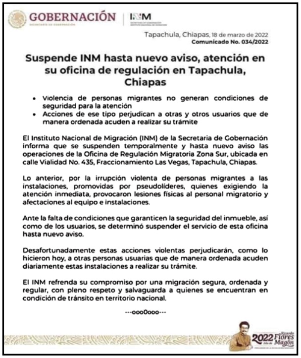 EL ORBE AL MOMENTO El INM suspendió actividades este sábado y hasta nuevo aviso, en la Subdelegación de Regulación Migratoria, al sur de Tapachula, por los actos vandálicos de migrantes realizados durante toda la semana