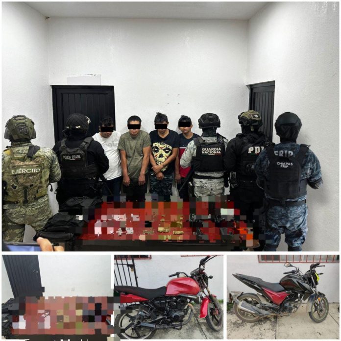 La FGE, la SSP y la FRIP detuvieron en flagrancia a Jesús “N”, Osvaldo “N”, Santos “N” y Alex “N”, como presuntos responsables de los delitos contra la salud, robo de vehículo y violación a la Ley Federal de Armas de Fuego y Explosivos, por hechos ocurridos en el municipio de Amatán, Chiapas.