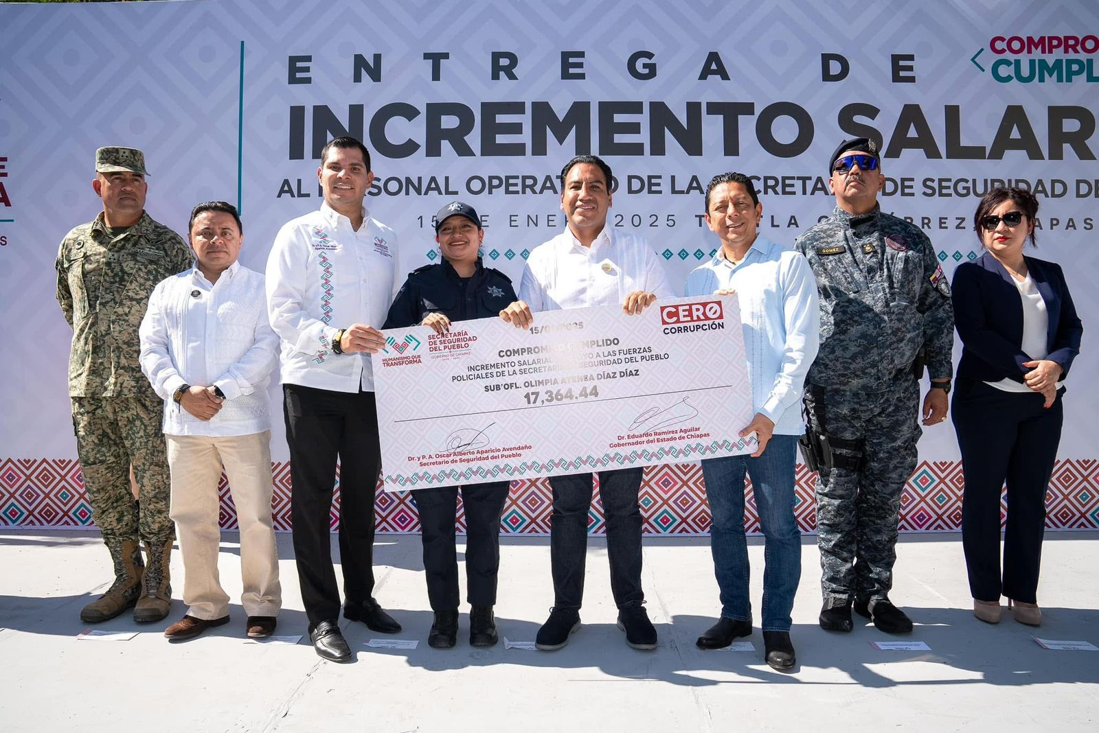 En un acto simbólico, el gobernador Eduardo Ramírez Aguilar constató la entrega del incremento salarial en beneficio de 7 mil 793 elementos operativos de la Secretaría de Seguridad del Pueblo (SSP), donde enfatizó que la lucha para pacificar al estado será exitosa, porque se tiene coraje, valentía, determinación y amor al pueblo, y porque las y los policías son los mejores hijos de Chiapas.