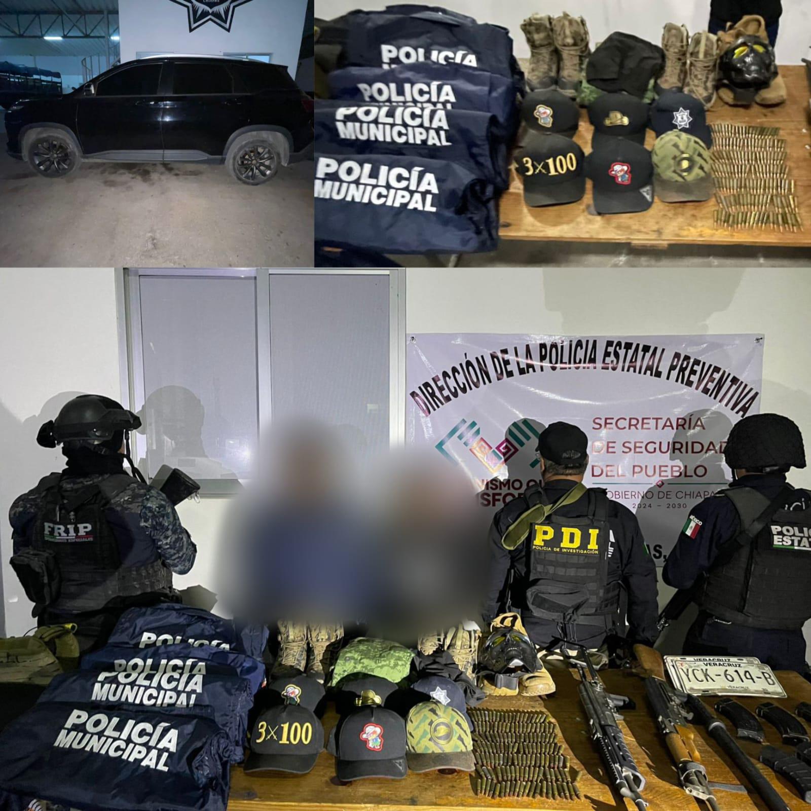 Las fuerzas del orden detuvieron a los imputados, después de inspeccionarlos físicamente y al automóvil en que se trasladaban, asegurándoles: un arma larga tipo AK-47, un arma larga tipo AK-63, 150 cartuchos útiles calibre 7.62 mm, 5 cargadores de arma larga, 2 chalecos tácticos, 4 placas balísticas, 4 guerreras, 6 gorras y un vehículo marca Chevrolet con reporte de robo en el estado de Veracruz.