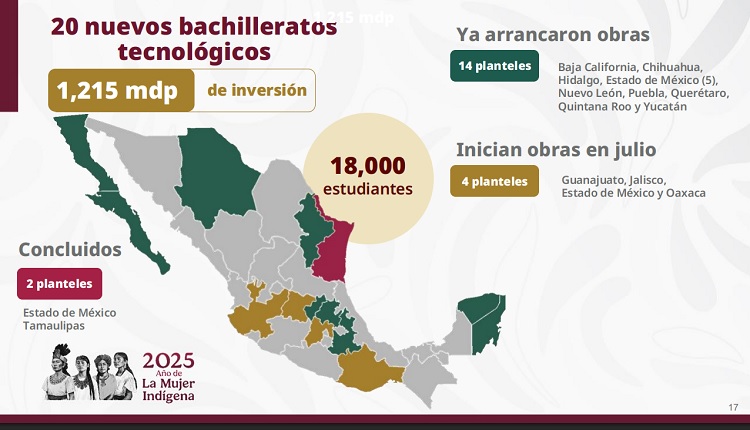 Además, se realizarán 33 ampliaciones de bachilleratos, en los cuales siete ya se iniciaron obras, en julio-agosto arrancan trabajos en 22 y cuatro planteles tendrán turno vespertino, con ello se abrirán 8 mil 910 espacios en media superior, a través de una inversión de 580 mdp. También serán 35 reconversiones de secundarias a bachilleratos, con lo cual se abrirán 10 mil 500 espacios a través de una inversión de 759.5 mdp de inversión.