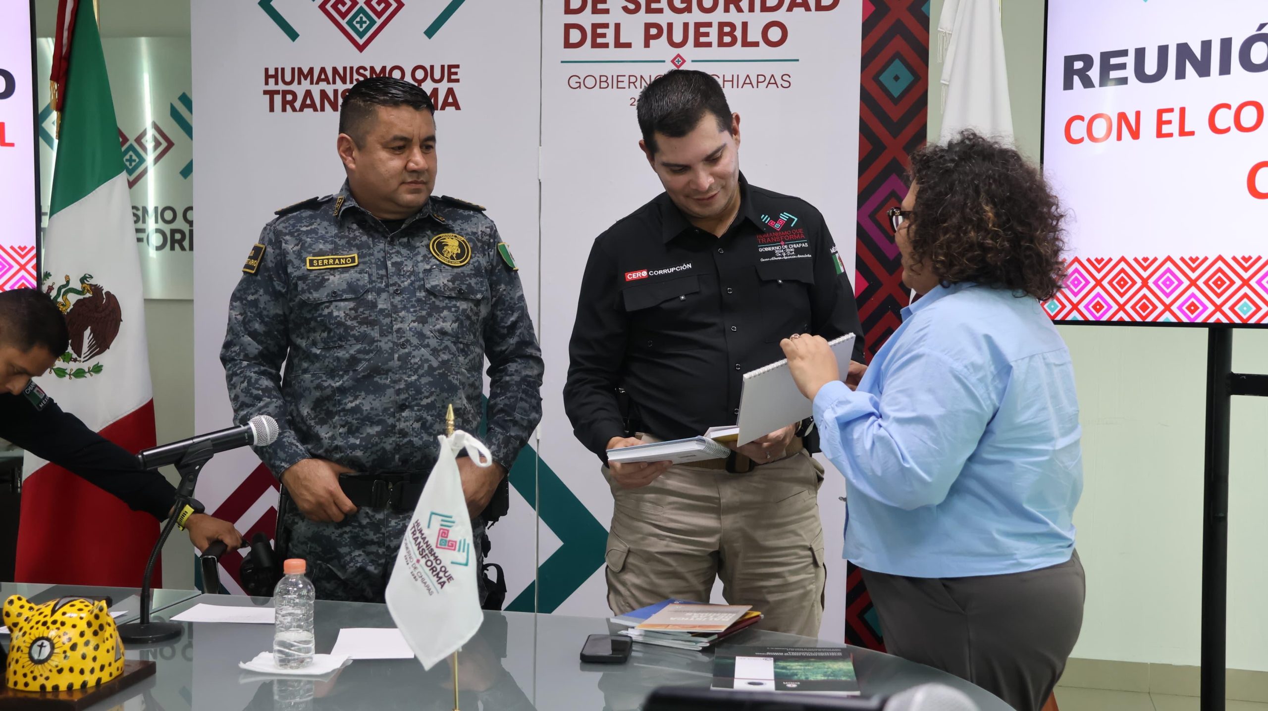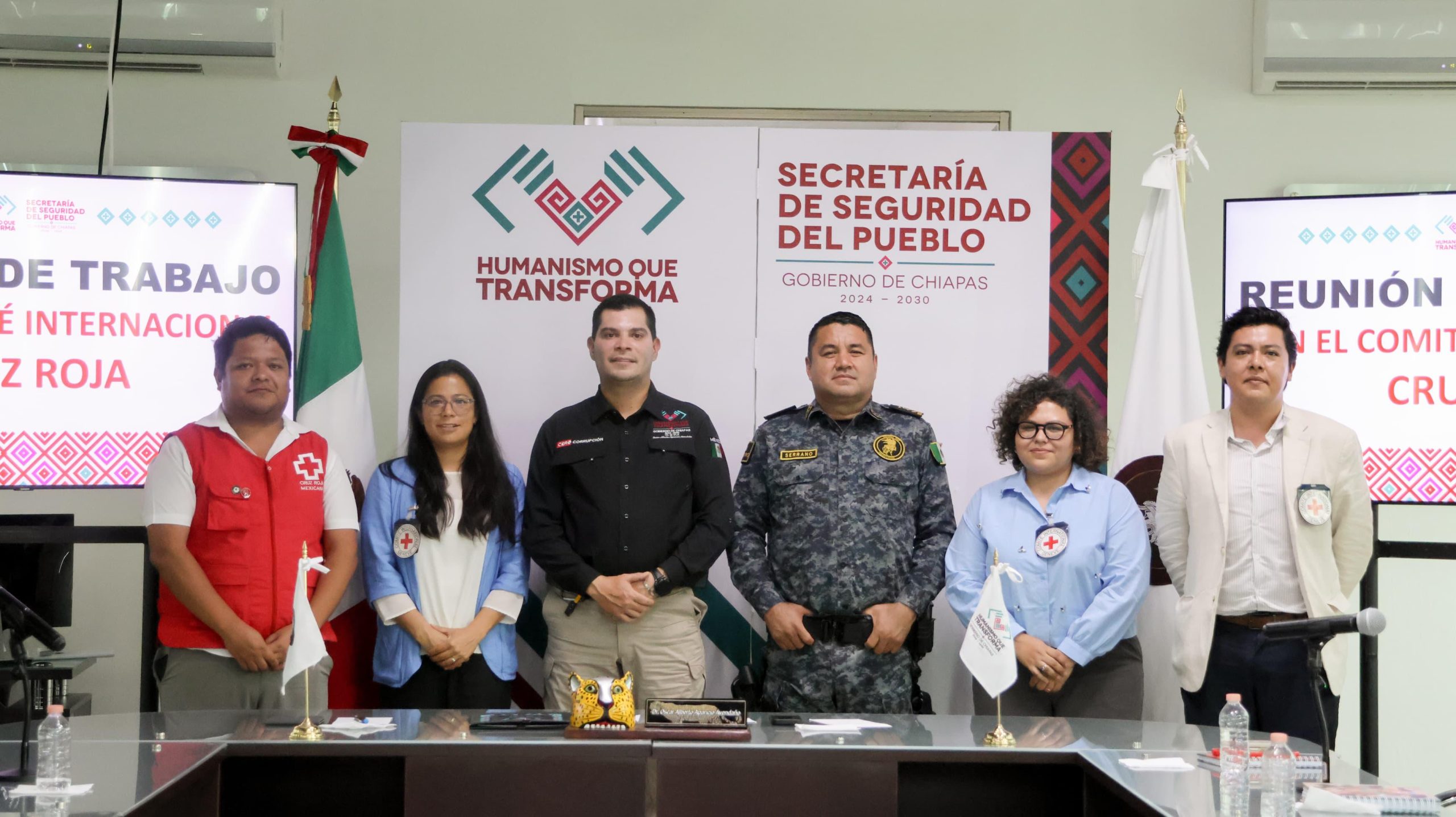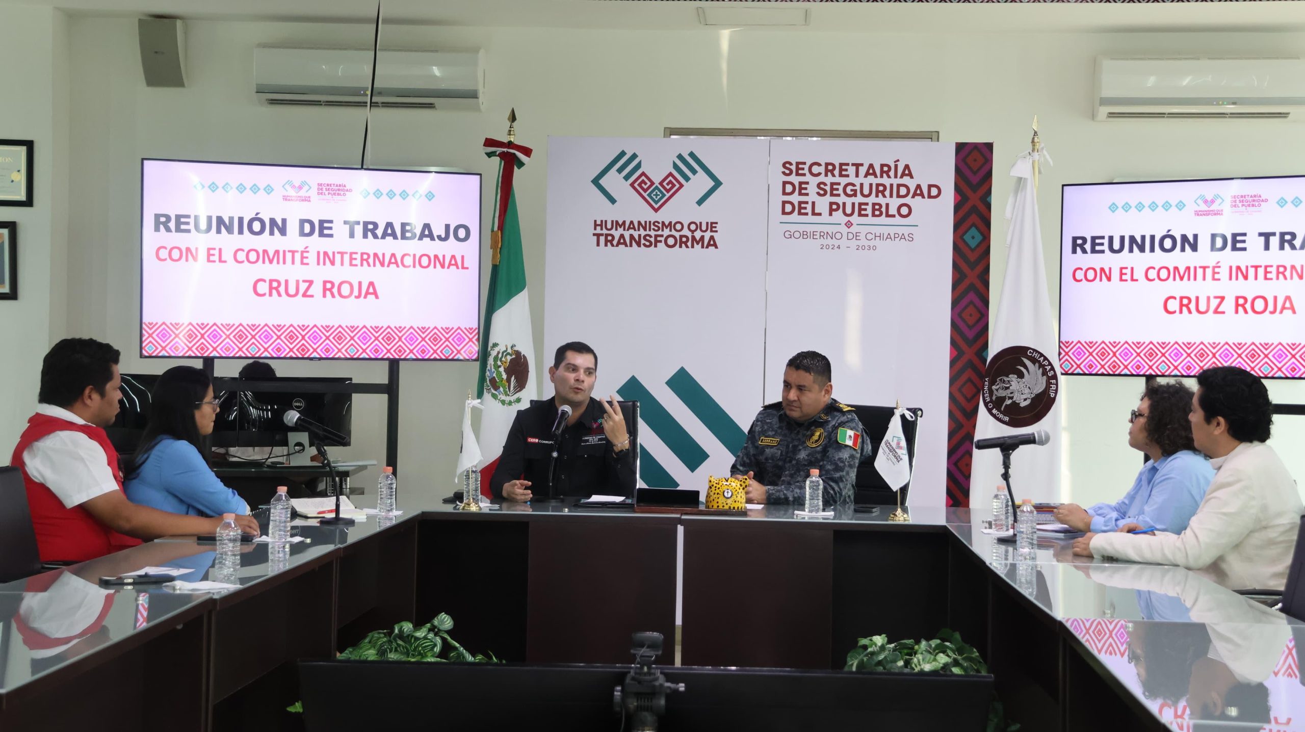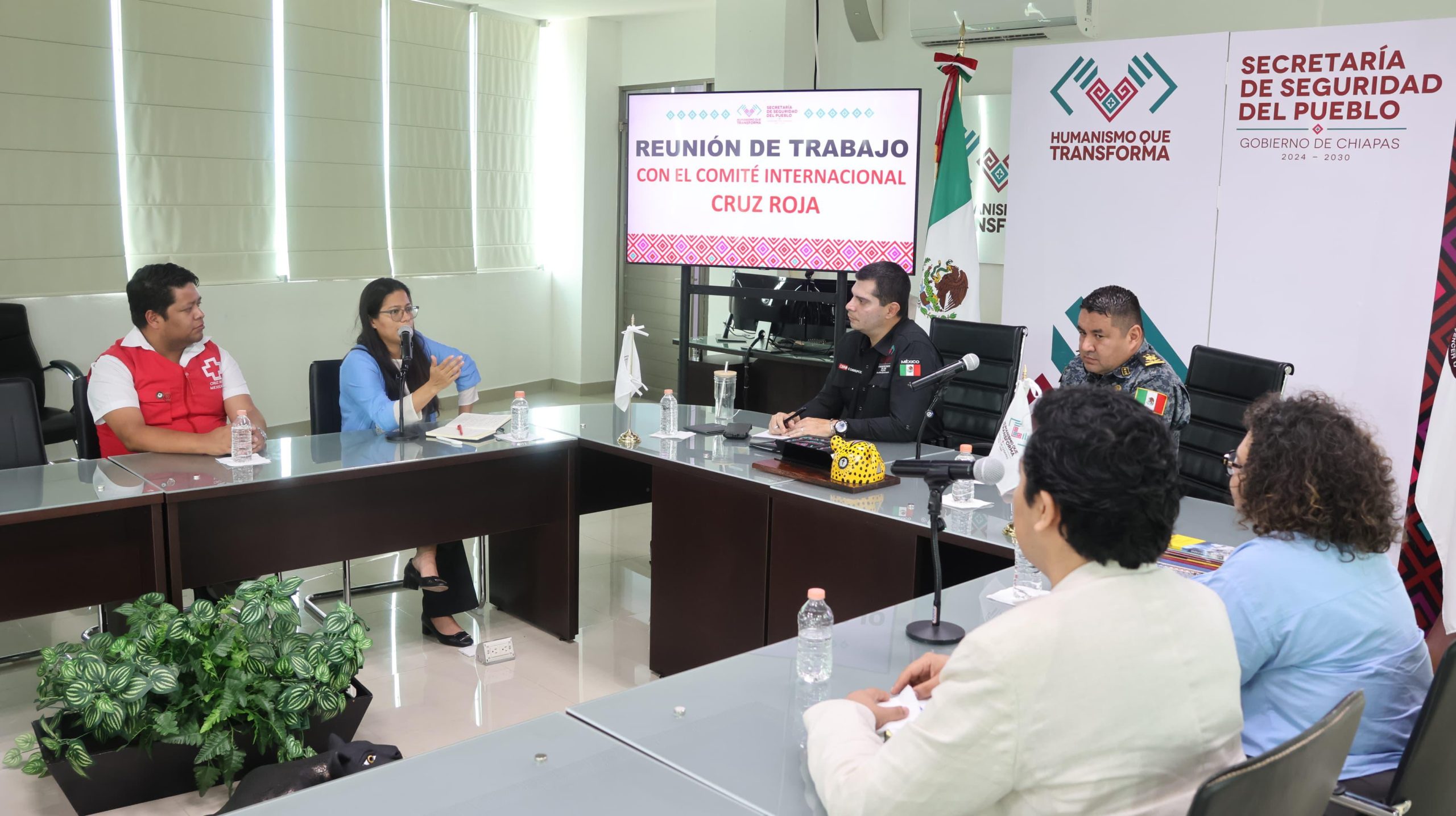 Tuxtla Gutiérrez, Chiapas; Con el objetivo de fortalecer la colaboración interinstitucional, la Secretaría de Seguridad del Pueblo, que lidera el doctor y piloto aviador, Óscar Alberto Aparicio Avendaño, llevó a cabo una reunión de trabajo con la maestra, Ana Luisa Cinta Narváez, asesora regional ante Fuerzas Armadas y de Seguridad de la Delegación Regional para México y América Central; la doctora, Montserrat Valdivia Ramírez, responsable del programa de Migración y Desplazamiento Interno para México; el licenciado Dorian Ramos Pérez, oficial del Programa de Protección y Respeto a la Asistencia en Salud en México, representantes del Comité Internacional de la Cruz Roja (CICR) y Humberto Gómez Martínez, Coordinador General de la Cruz Roja del estado.