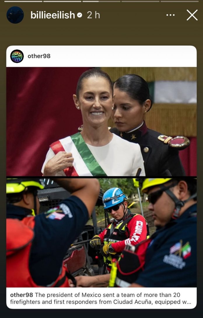 La cantante Billie Eilish, reconoce apoyo de la Presidenta Claudia Sheinbaum, a través de una historia en Instagram, en la que compartió una nota en la que se destaca el envío de 20 bomberos mexicanos a Texas tras las inundaciones.
