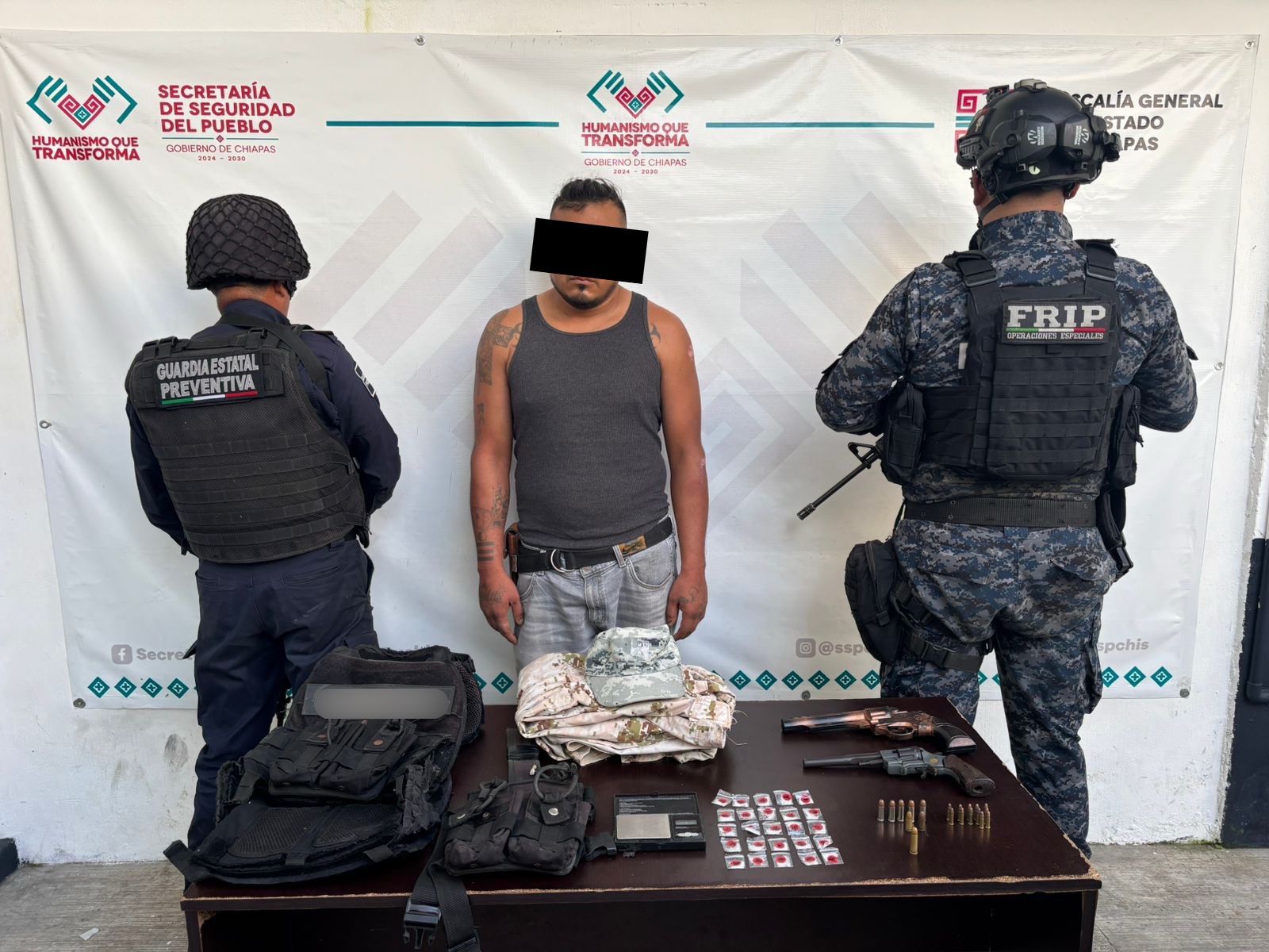 La Secretaría de Seguridad del Pueblo (SSP) a través de la Fuerza de Reacción Inmediata Pakal (FRIP) y la Guardia Estatal Preventiva, en coordinación con la Fiscalía General del Estado (FGE) y la Secretaría de Seguridad y Protección Ciudadana (SSPC) del Gobierno Federal, detuvieron a un masculino por los probables delitos contra la salud, violación a la Ley Federal de armas de fuego y usurpación de funciones, en el municipio de Huixtla.