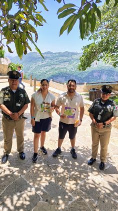 En este sentido, en los puntos turísticos: Playa del Sol, Puerto Arista, Madre Sal y Boca del Cielo, ubicados en el municipio de Tonalá, playas y en el parque Central del municipio de Tapachula de Córdova y Ordoñez; así como en el parque Central “Benito Juárez” en Comitán de Domínguez, Parque Nacional Cañón del Sumidero, en Tuxtla Gutiérrez y el centro ecoturístico Cascadas de Agua Azul, se informó a través de trípticos que, la Guardia Estatal de Turismo tienen presencia en toda la entidad, para brindar apoyo o auxilio en casos de fallas mecánicas, falta de combustible o asistencia a través del número de emergencias 911 y Denuncia Anónima 089, para garantizar que su estancia sea segura.