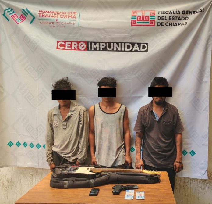 Ante la denuncia, elementos de la fuerza interinstitucional establecieron el protocolo de actuación y detuvieron a Cristian “N”, de nacionalidad hondureña, Lucio “N” y Ulises “N”, ambos mexicanos, a quienes les aseguraron una pistola de plástico, dinero en efectivo, teléfono celular y una guitarra eléctrica.