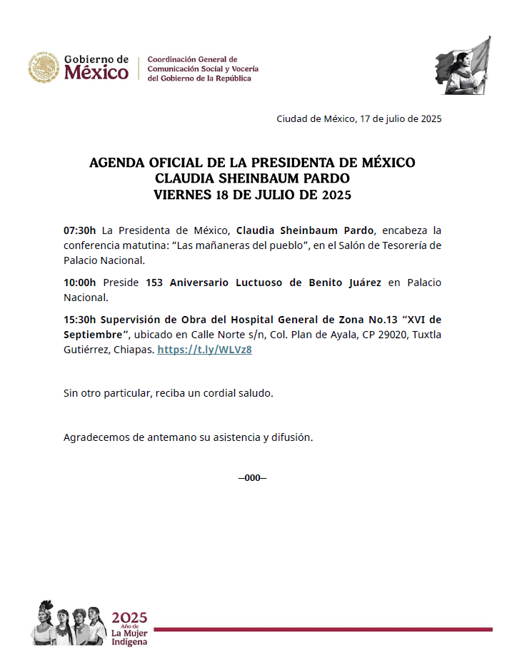 Para arrancar con su gira de fin de semana, la Presidenta de México, Claudia Sheinbaum Pardo, visitará Chiapas, donde realizará la supervisión de obra del Hospital General de Zona No.13 “XVI de Septiembre” en Tuxtla, Gutiérrez.