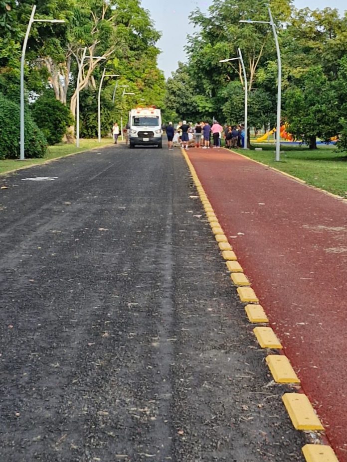 Según testigos, el señor —de tez blanca, canoso, vestido con ropa oscura y short blanco con negro— fue encontrado sin signos vitales, presuntamente mientras realizaba ejercicio matutino.