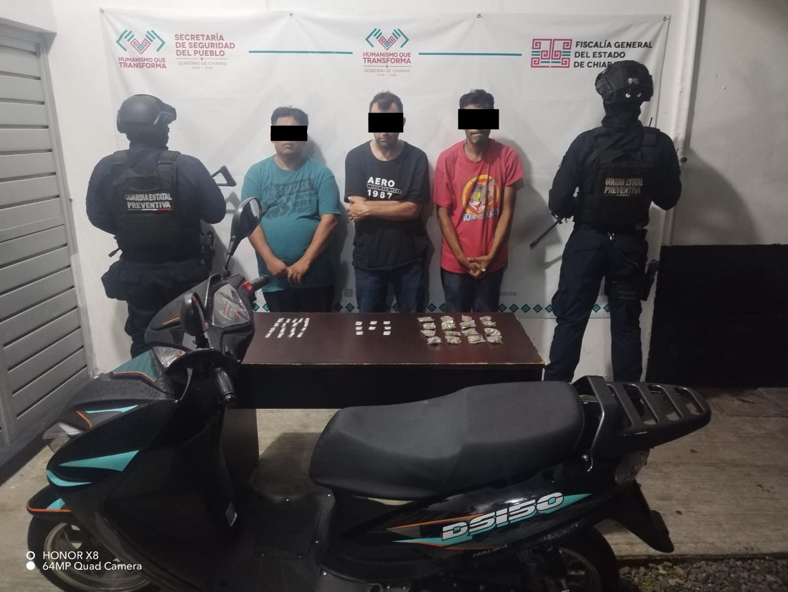 Las acciones de combate al narcomenudeo en el estado de Chiapas implementado por elementos de la fuerza interinstitucional, en el municipio de Cacahoatán obtuvieron como resultado la detención de Gustavo “N”, José “N” y Wilder “N” en la colonia Miguel Hidalgo, en posesión de 25 dosis de la presunta droga conocida como cristal, 16 bolsitas de hierba verde con las características de la marihuana, así como una motocicleta marca italika de color negra sin placas.
