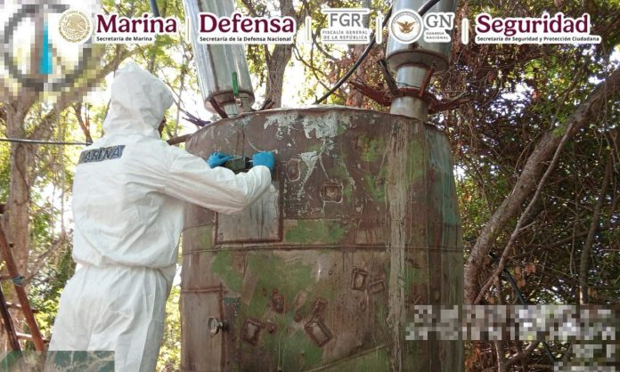 Esta acción se llevó a cabo cuando elementos de la Armada de México, al realizar recorridos terrestres, localizaron dos laboratorios donde hallaron alrededor de 4,900 kilos de metanfetamina, 3,180 litros de sustancias químicas, seis reactores de 1,500 litros, cuatro reactores de 500 litros, 13 destiladoras de 100 litros, una mezcladora de 1,000 litros, y material diverso.