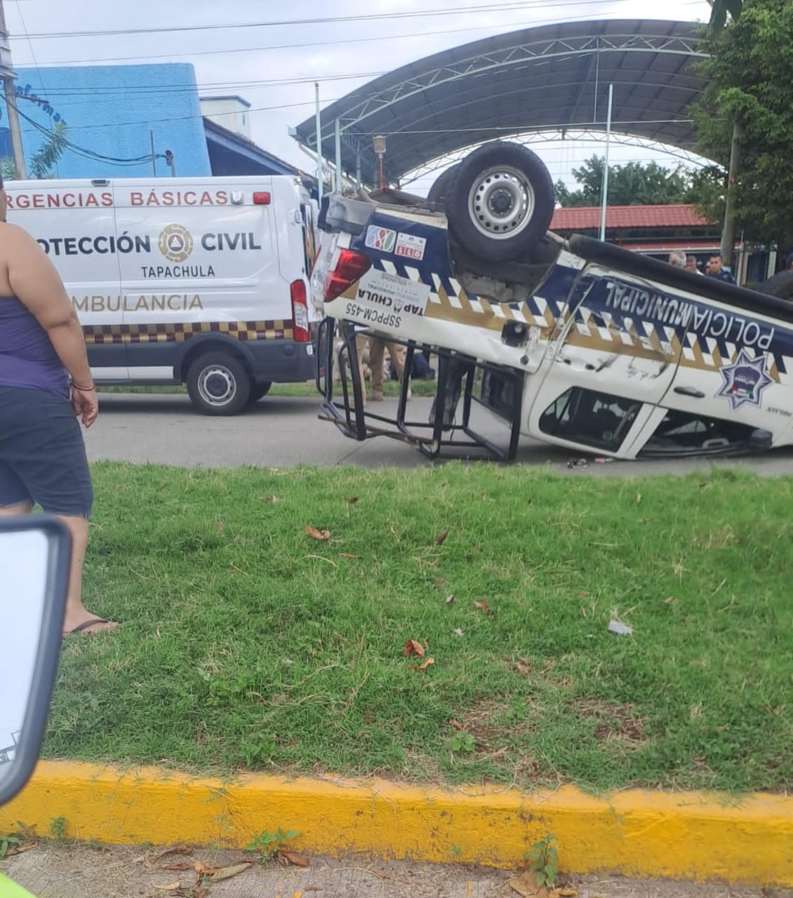 Elementos de la Policía Municipal volcaron una patrulla, cuando presuntamente realizaban una persecución en la ciudad de #Tapachula.