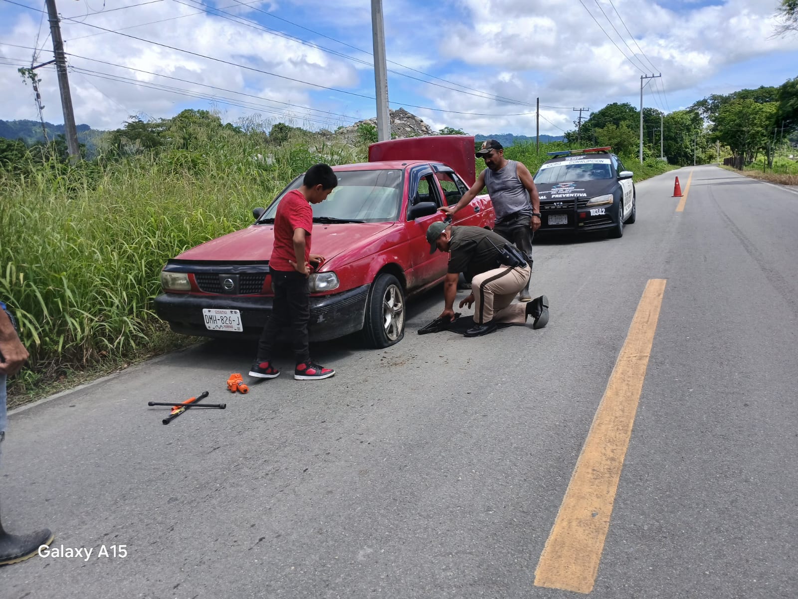 En la vía Pichucalco – Escopetazo, se brindó apoyo a un conductor que presentó un percance menor. Se efectuó el cambio de neumático y abanderamiento preventivo, restableciendo el flujo seguro del tránsito.