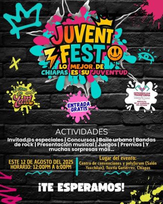 En conmemoración al día Internacional de la Juventud, la líder juvenil, Yazmín Ramírez en colaboración con el Instituto de la Juventud del Estado, extienden la invitación a todas las juventudes del Estado de Chiapas a asistir al Juvent Fest, un evento pensado y organizado para celebrar y a lo mejor que tiene Chiapas, ¡su juventud!