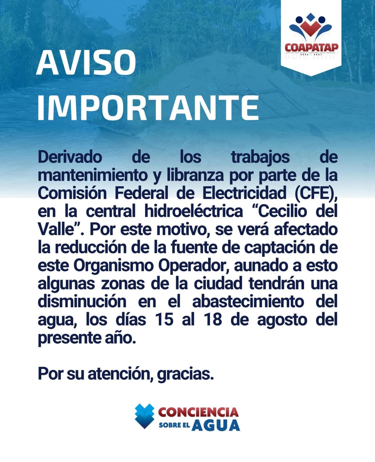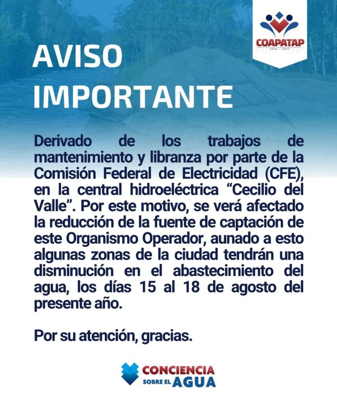 No va haber agua del 15 al 18 de agosto. Tome sus precauciones.
