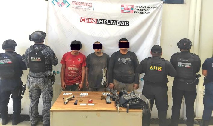 En operativo interinstitucional, la Secretaría de Seguridad del Pueblo (SSP) a través de la Fuerza de Reacción Inmediata Pakal (FRIP), la Guardia Estatal Preventiva y la Guardia Estatal Fronteriza, en coordinación con la Agencia de Investigación e Inteligencia Ministerial (AIIM) de la Fiscalía General del Estado (FGE), la Secretaría de Seguridad y Protección Ciudadana (SSPC) del Gobierno Federal, la Guardia Nacional, el Ejército Mexicano y la Policía Municipal detuvieron a tres masculinos con armas de fuego y presuntos narcoticos en el municipio de Huehuetán.