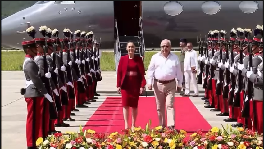 La Presidenta de México Claudia Sheinbaum llega a Petén, Guatemala, donde fue recibida por el Ministro de Relaciones Exteriores de la República de Guatemala, Carlos Ramiro Martínez.