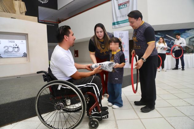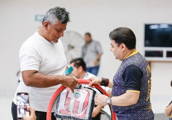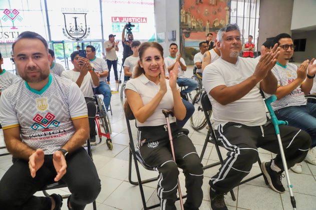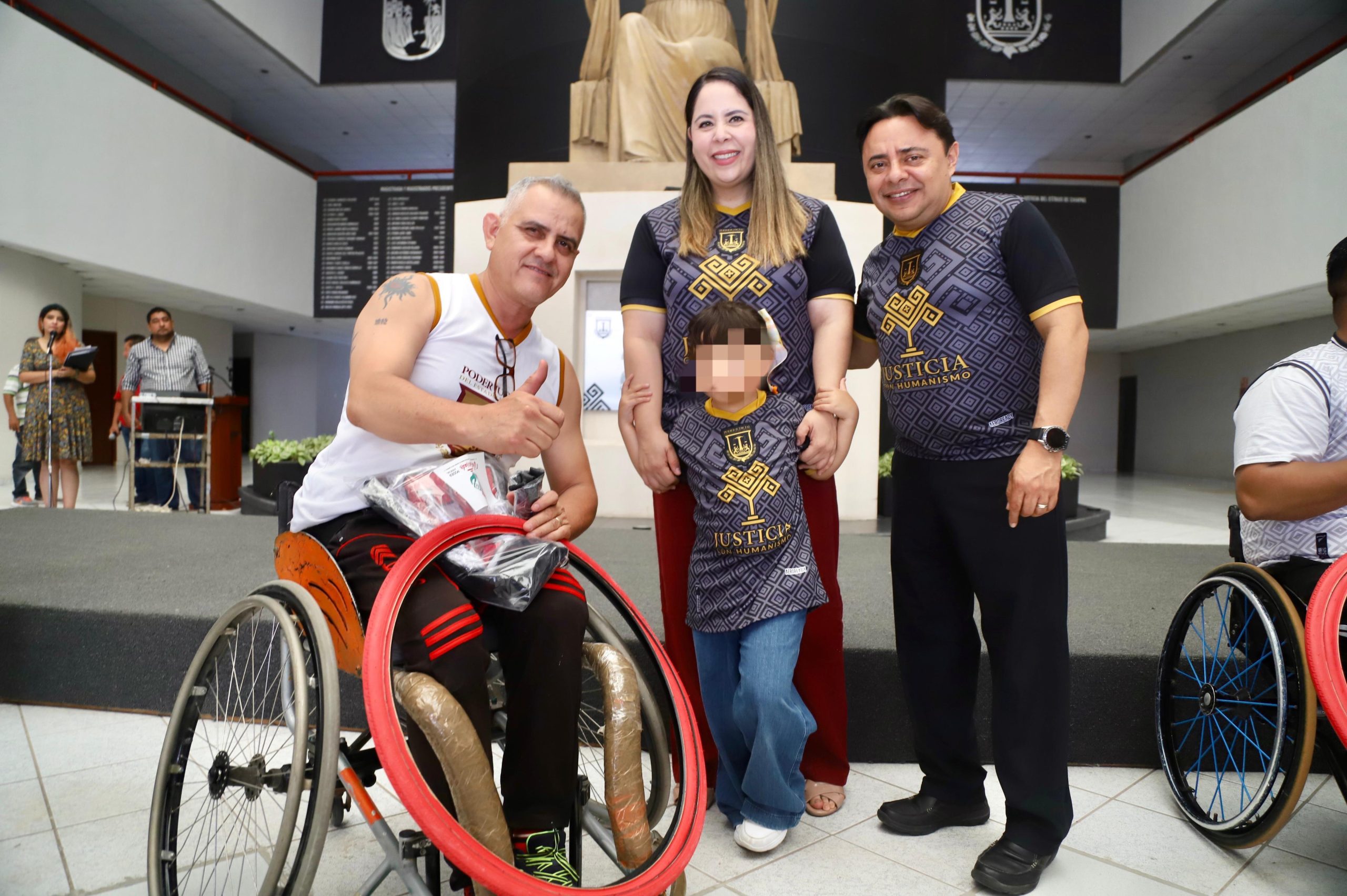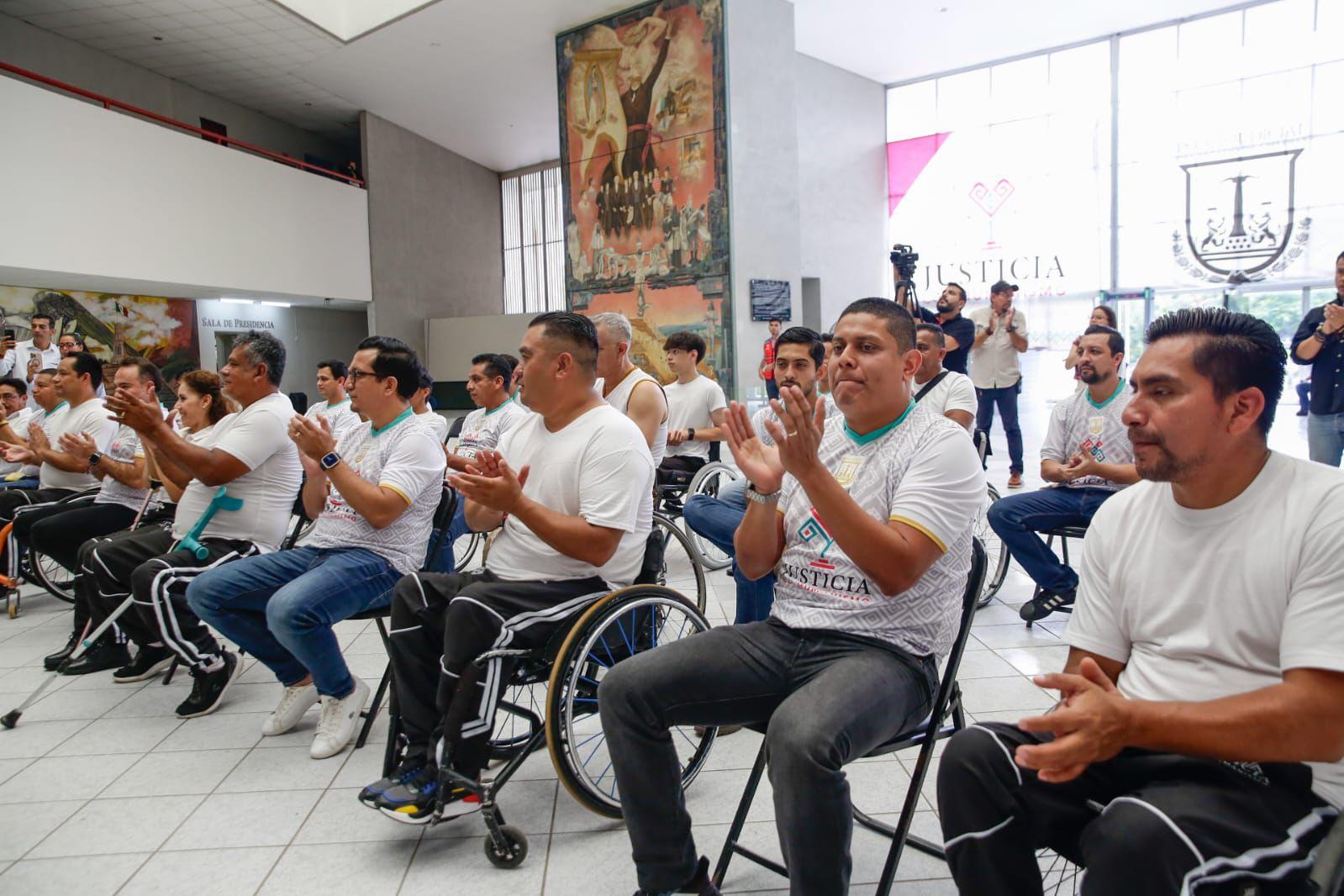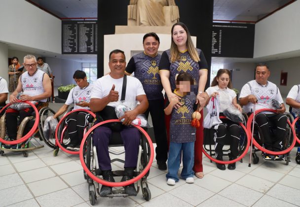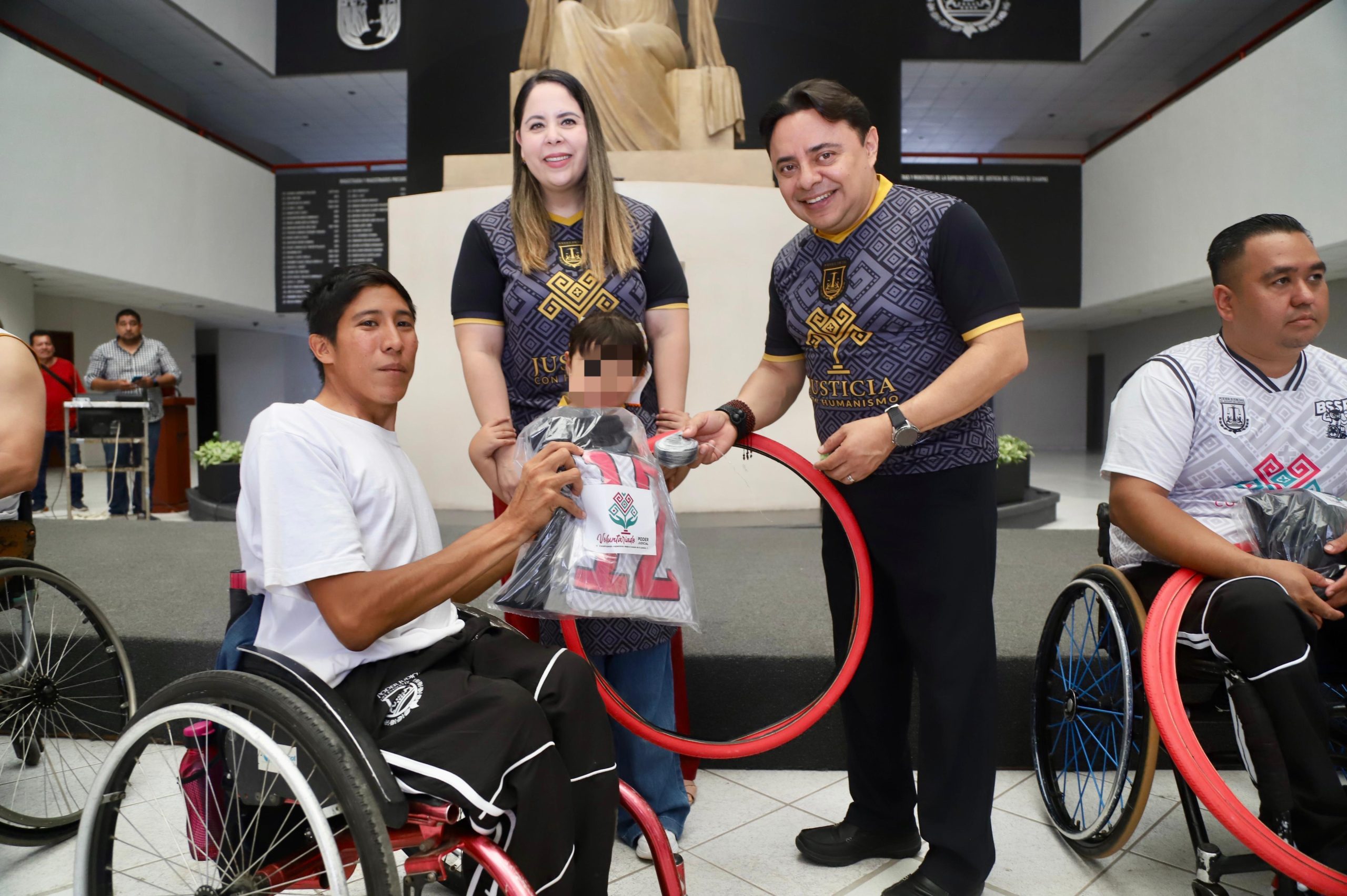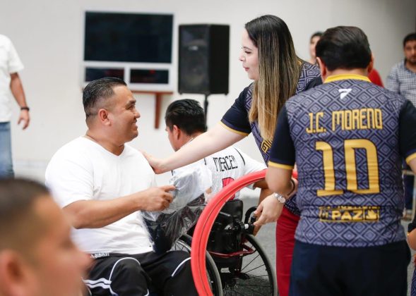 Durante el acto se entregaron uniformes para el equipo de básquetbol sobre ruedas, incluyendo aditamentos especiales para sus sillas, así como uniformes para el equipo de fútbol soccer.