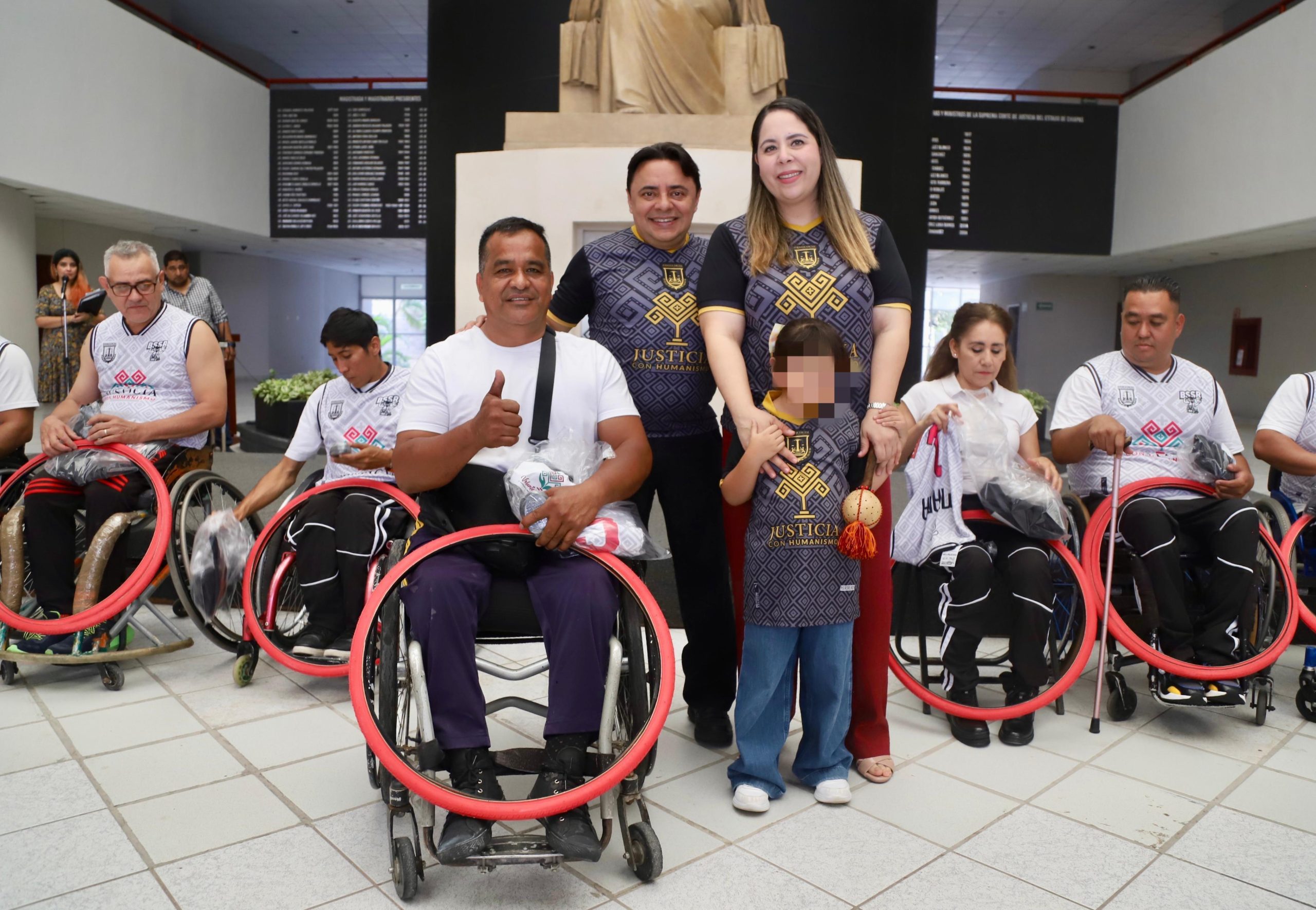 -Voluntariado del Poder Judicial entrega uniformes a equipos de básquetbol sobre ruedas y fútbol.