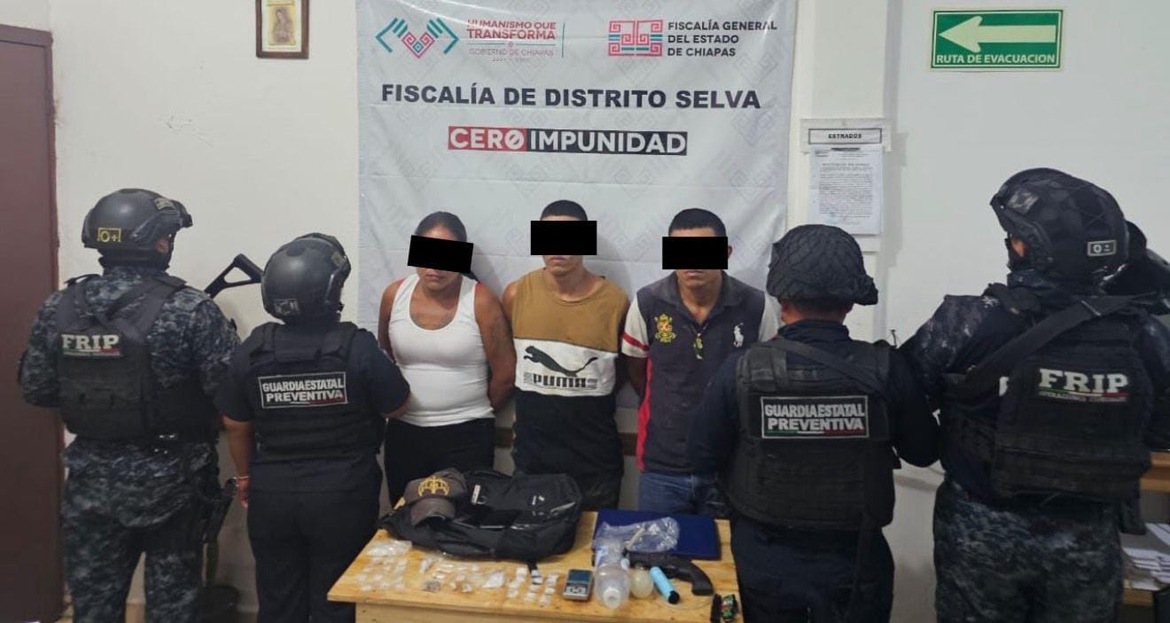La Secretaría de Seguridad del Pueblo (SSP) a través de la Fuerza de Reacción Inmediata Pakal (FRIP) y la Guardia Estatal Preventiva en coordinación con la Fiscalía General del Estado (FGE) y Secretaría de Seguridad y Protección Ciudadana (SSPC) del Gobierno Federal, detuvieron a tres presuntos responsables del delito contra la salud y portación de arma de fuego, en el municipio de Palenque.