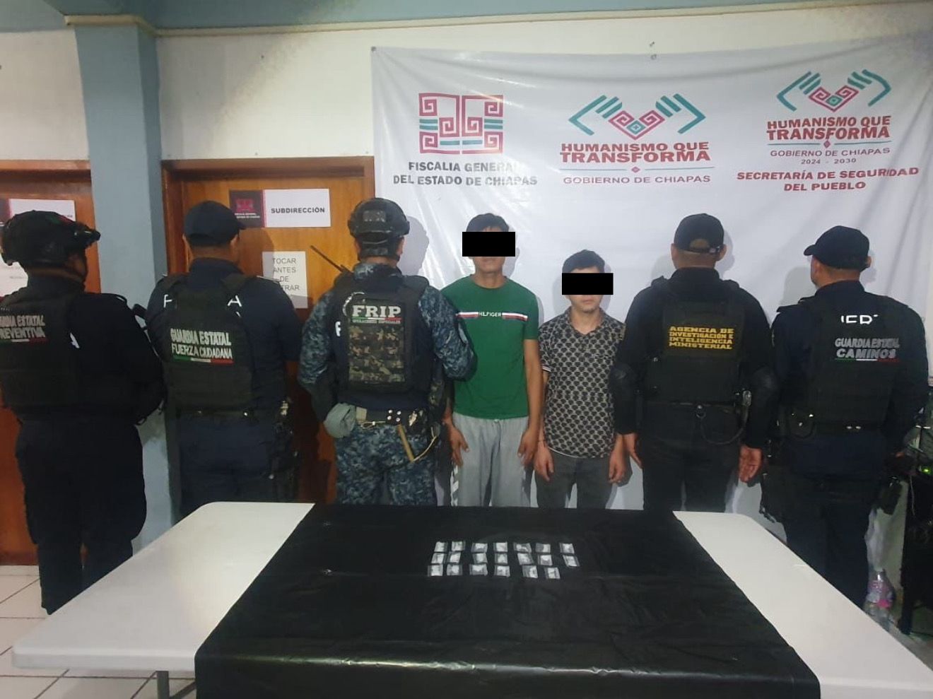 La Secretaría de Seguridad del Pueblo (SSP) a través de la Fuerza de Reacción Inmediata Pakal (FRIP), la Guardia Estatal Preventiva, Fuerza Ciudadana, y Caminos, en coordinación con la Fiscalía General del Estado (FGE) y la Secretaría de Seguridad y Protección Ciudadana (SSPC) del Gobierno Federal, detuvieron a dos masculinos con presuntos narcóticos, en el municipio de Frontera Comalapa.