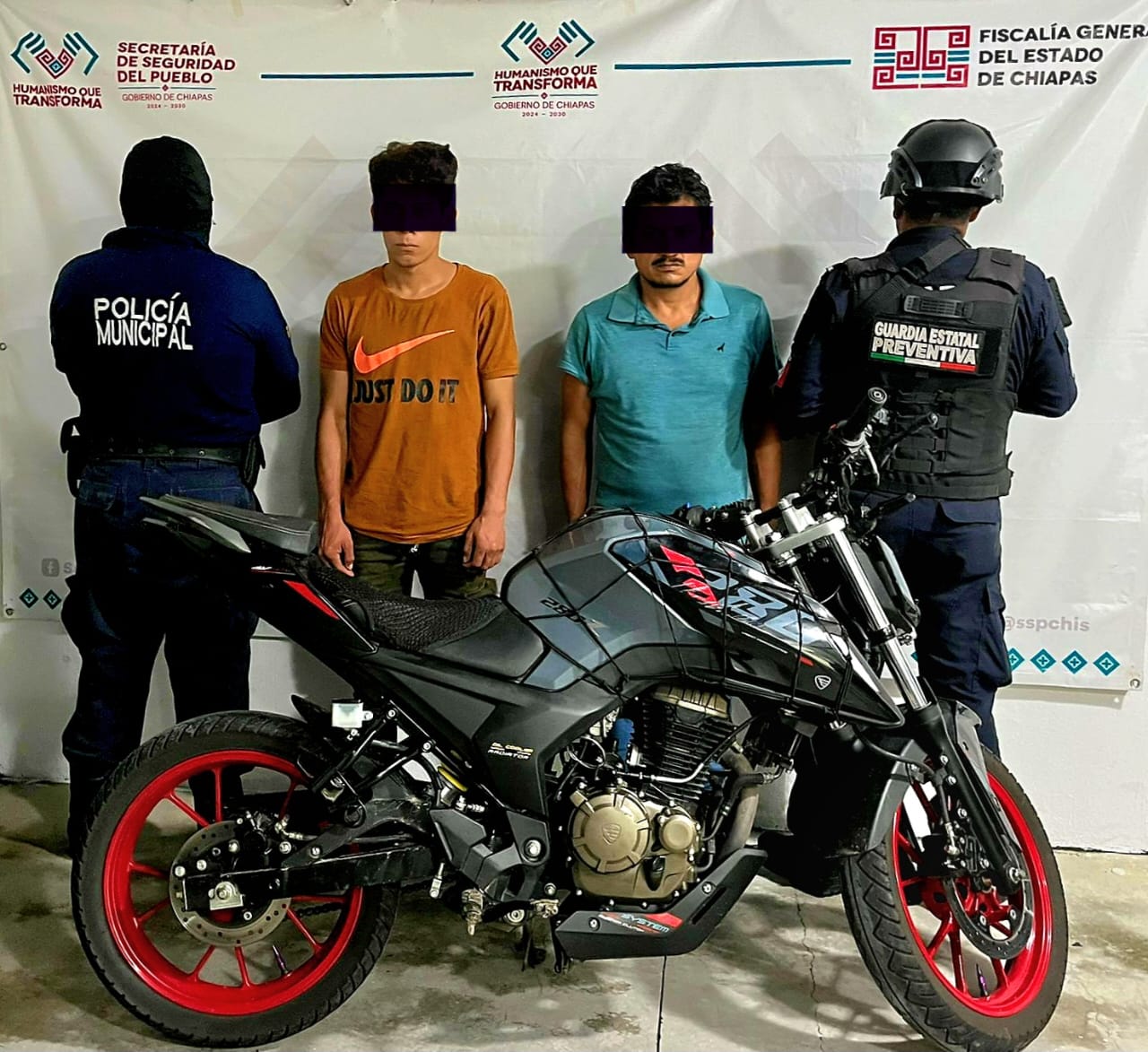 Como parte de la acciones preventivas y disuasivas, la Secretaría de Seguridad del Pueblo (SSP) a través de la Guardia Estatal Preventiva, en coordinación con la Fiscalía General del Estado (FGE), la Secretaría de Seguridad y Protección Ciudadana (SSPC) del Gobierno Federal y la Policía Municipal, detuvieron a dos masculinos por el probable delito contra la salud en su modalidad de narcomenudeo, en el municipio de Tuxtla Chico.