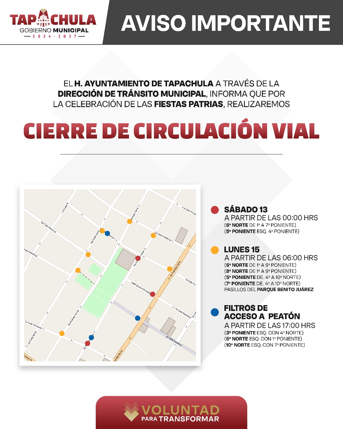 El Ayuntamiento de Tapachula informa a la población que con motivo de la celebración de las Fiestas Patrias, serán cerradas a la circulación las siguientes calles y avenidas a partir del sábado 13 de septiembre.