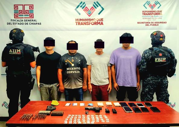 En operativo interinstitucional, la Secretaría de Seguridad del Pueblo (SSP) a través de la Fuerza de Reacción Inmediata Pakal (FRIP) en coordinación con la Agencia de Investigación e Inteligencia Ministerial (AIIM) de la Fiscalía General del Estado (FGE) y la Secretaría de Seguridad y Protección Ciudadana (SSPC) del Gobierno Federal, detuvieron a cuatro masculinos con narcóticos y arma de fuego, en el municipio de Cintalapa de Figueroa.