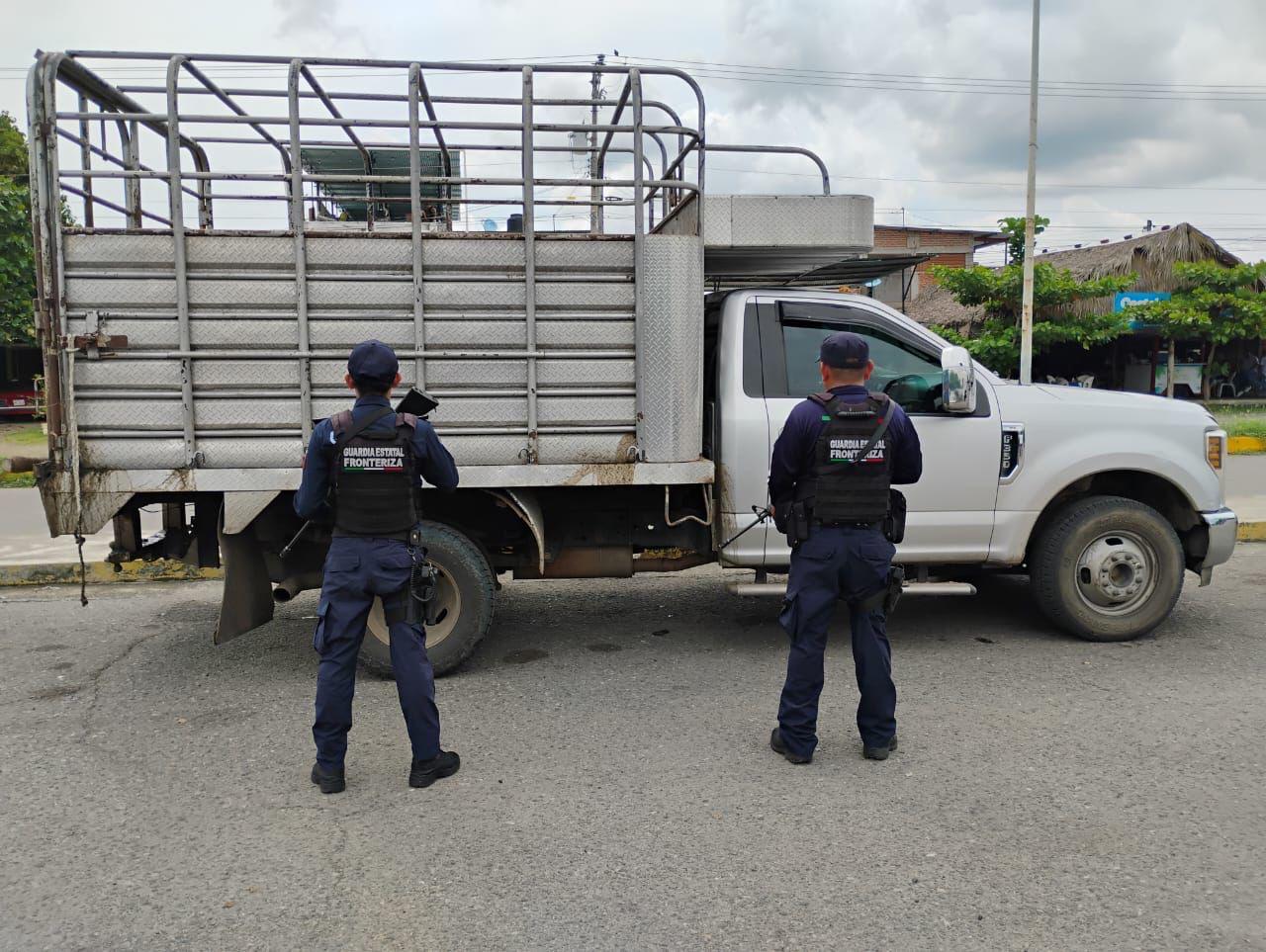 En la Perla del Soconusco, las acciones preventivas y disuasivas, permitieron el aseguramiento de la unidad marca Ford F350 de color gris con placas de circulación del estado de Chiapas y reporte de robo, además del vehículo marca Chevrolet de color blanco y placas circulación del estado de Veracruz, el cual cuenta con oficio de búsqueda, localización y presentación, por la comisión de presuntos hechos delictuosos.