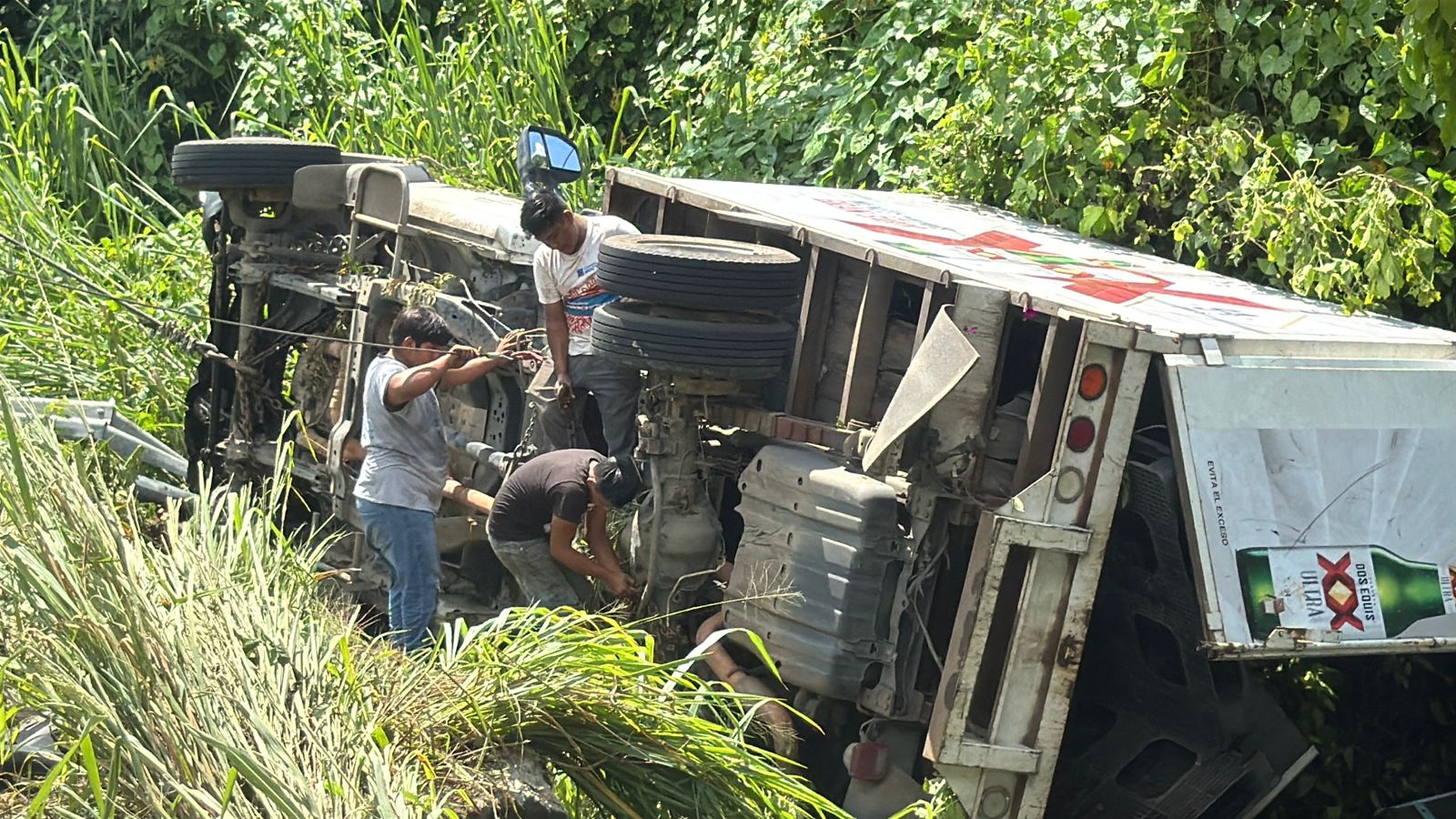 Volcadura de camión cervecero en carretera Puerto Madero, Tapachula