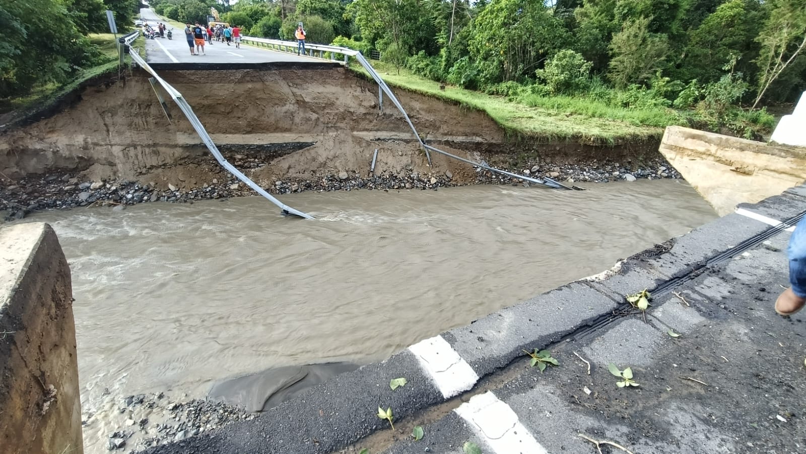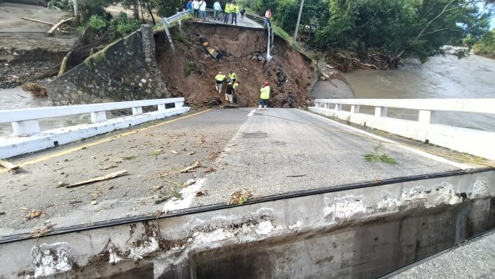 Mapastepec, chiapas a 20 de septiembre 2025.- En El Tramo carretero Arriaga Tapachula, derivado a las fuertes lluvias de ayer Viernes en la zona costa colapsó el puente Tablazon de Mapastepec.