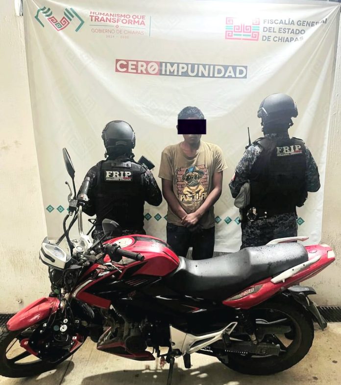La Secretaría de Seguridad del Pueblo (SSP) a través de la Fuerza de Reacción Inmediata Pakal (FRIP) en coordinación con la Fiscalía General del Estado (FGE) y la Secretaría de Seguridad y Protección Ciudadana (SSPC) del Gobierno Federal, detuvieron a un masculino con motocicleta robada en el municipio de Tapachula.