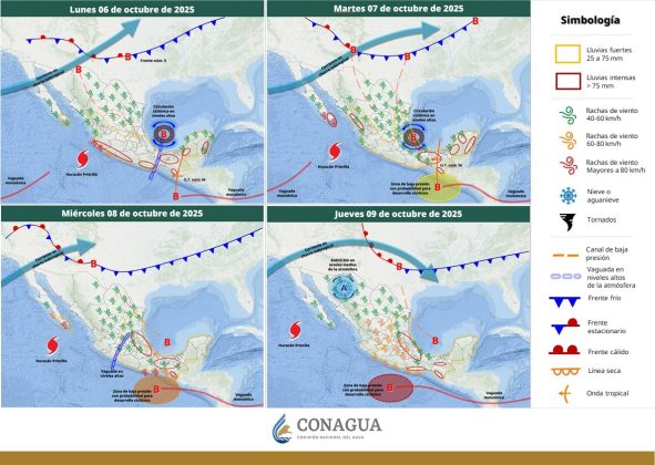 A su vez, un canal de baja presión en el interior de la República Mexicana en combinación con la entrada de humedad del océano Pacífico y golfo de México, propiciaran chubascos y lluvias fuertes en el noroeste, norte, noreste y centro de México.