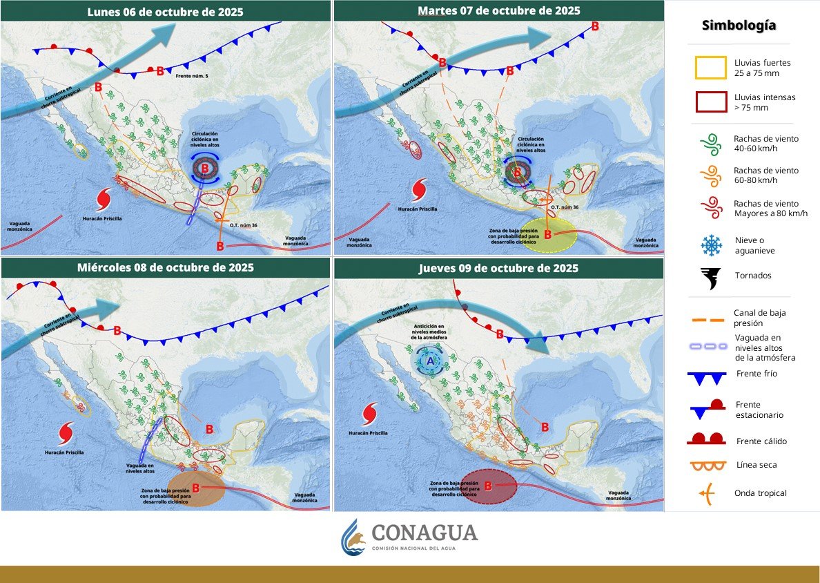El huracán Priscilla del océano Pacífico se desplazará lentamente frente a las costas de Jalisco, con trayectoria hacia la costa occidental de Baja California Sur, su circulación y desprendimientos nubosos originarán lluvias puntuales intensas en Jalisco y Colima,además de lluvias muy fuertes en Baja California Sur, Sinaloa, Nayarit, Michoacán y Guerrero; asimismo, se pronostican rachas de viento de 80 a 100 km/h y oleaje de 5.0 a 6.0 metros de altura en las costas de Jalisco y Colima; viento con rachas de 50 a 70 km/h y oleaje de hasta 4.0 metros en las costa de Baja California Sur y Michoacán; y rachas de viento de 40 a 50 km/h con oleaje de hasta 3.0 metros de altura en las costas de Sinaloa, Nayarit y Guerrero (occidente).
