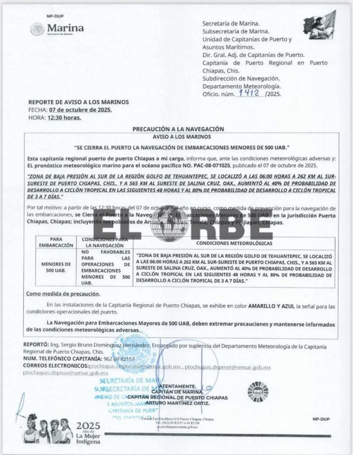 Tapachula, Chiapas 7 de octubre del 2025.- Al medio día de este 7 de octubre, la capitanía de Puerto, en Puerto Chiapas, anuncio el cierra a la navegación de embarcaciones menores de 500 UAB.