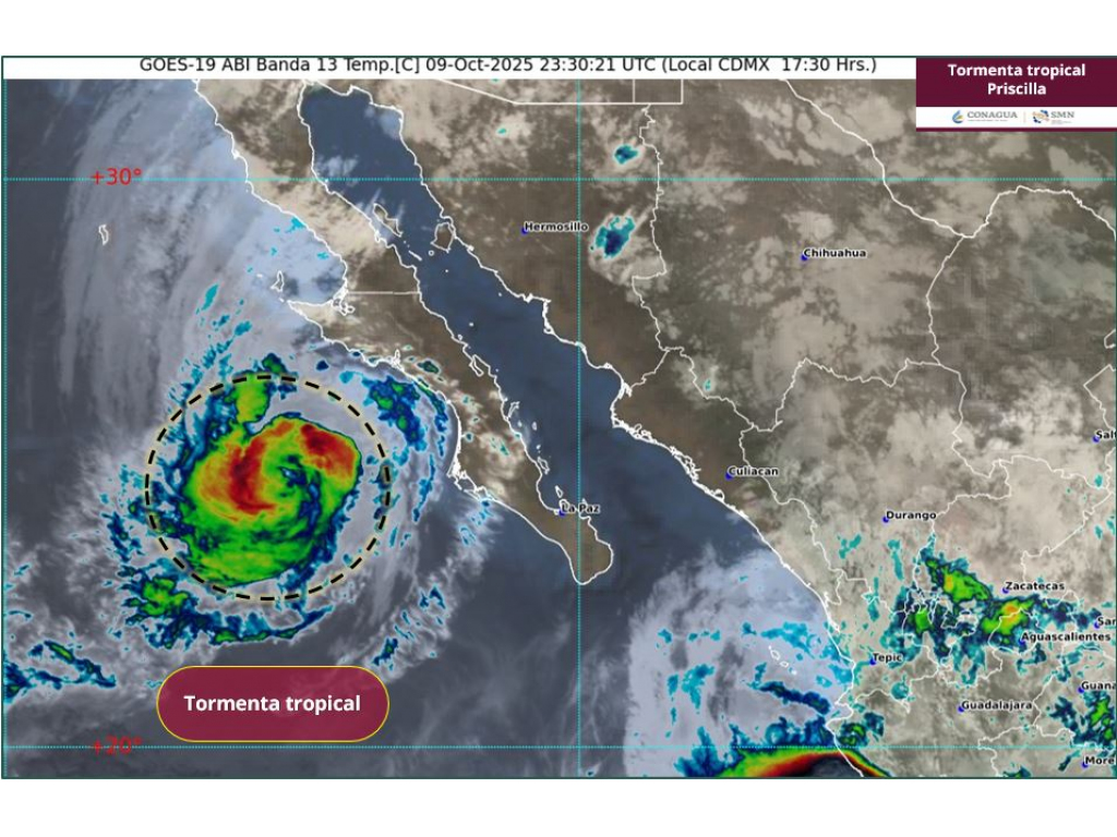 Este día, la tormenta tropical Priscilla continuará su desplazamiento paralelo a la costa occidental de Baja California Sur, por lo que su circulación y bandas nubosas mantendrán vientos y lluvias fuertes, además de oleaje elevado en dicha región. Por otra parte, una zona de baja presión con probabilidad para desarrollo ciclónico o posible ciclón tropical, se localizará frente a las costas de Guerrero y Michoacán, su extensa circulación y desprendimientos nubosos, en interacción con un canal de baja presión sobre el noreste y oriente del país, además de los desprendimientos nubosos de la vaguada monzónica en el Pacífico Sur Mexicano, mantendrán un temporal de lluvias muy fuertes a intensas en las regiones mencionadas, además del sur y sureste del territorio nacional. Simultáneamente, se prevén lluvias fuertes a muy fuertes en el occidente y centro del país; así como vientos muy fuertes a intensos y oleaje elevado en las costas de Oaxaca, Guerrero, Michoacán y Colima. Así mismo, un canal de baja presión sobre la Mesa del Norte aunado al ingreso de humedad del océano Pacífico y golfo de México originarán chubascos y lluvias fuertes en la región mencionada. Mientras que el ingreso de humedad originado por la corriente en chorro subtropical generará chubascos y lluvias fuertes en Baja California. Finalmente, un segundo canal de baja presión extendido sobre la península de Yucatán, aunado al ingreso de humedad del mar Caribe, originará chubascos y lluvias fuertes en dicha península.
