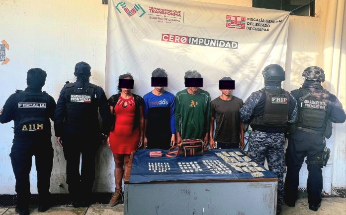 La Secretaría de Seguridad del Pueblo (SSP) a través de la Fuerza de Reacción Inmediata Pakal (FRIP), la Guardia Estatal Preventiva y la Guardia Estatal Fronteriza, en coordinación con la Agencia de Investigación e Inteligencia Ministerial (AIIM) de la Fiscalía General del Estado (FGE) y la Secretaría de Seguridad y Protección Ciudadana (SSPC) del Gobierno Federal, detuvieron a cuatro personas en posesión de narcóticos en el municipio de Tapachula.