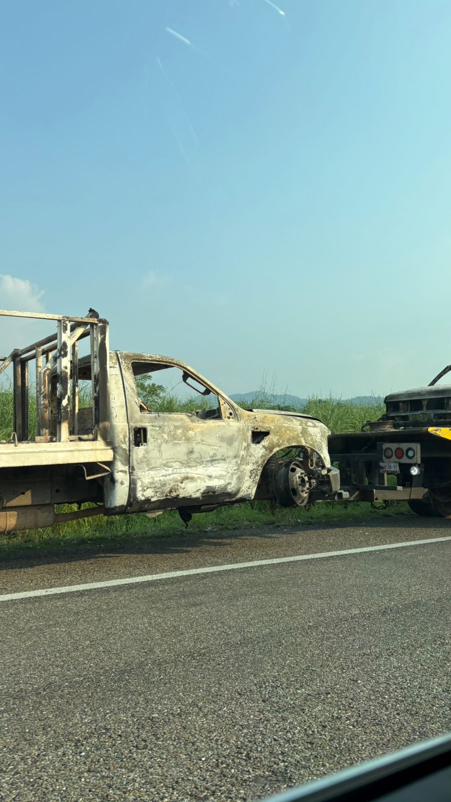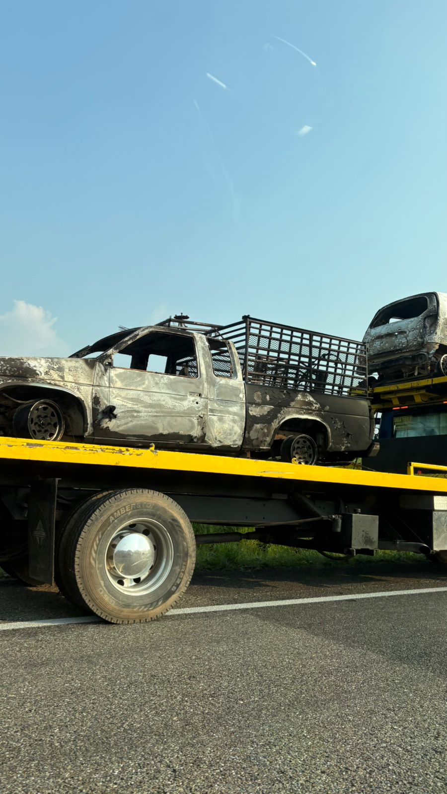 Así quedaron los vehículos después de los acontecimientos ocurridos a 10 km de la caseta de cobro de jiquipilas de la segunda caseta de Tuxtla Gutiérrez a Tapachula.